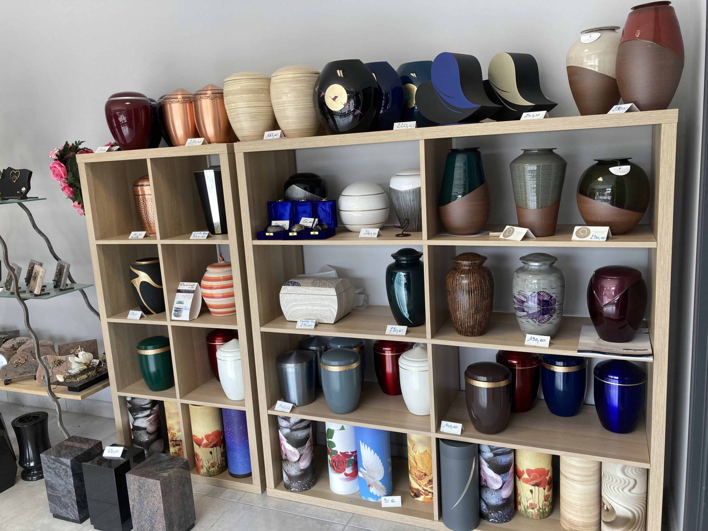 En plus de nos plaques funéraires et de nos fleurs artificielles, Pompes Funèbres Blanc-Fargeon vous propose en magasin de nombreux articles funéraires supplémentaires pour rendre hommage à vos proches de manière personnelle.